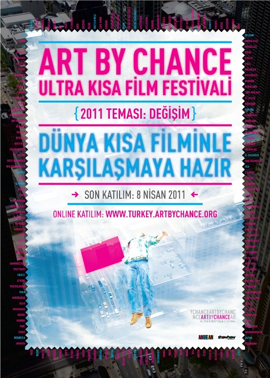 Bu sene 13 Mayıs – 13 Haziran tarihleri arasında gerçekleştirilecek festivalin teması “değişim”. Milyonlarca insana ulaşma yolundaki ilk adımsa çektiğiniz 30 saniyelik kısa filmi http://turkey.artbychance.org adresine yüklemek: