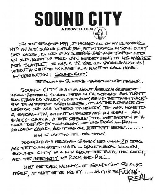 Sound City’den eviymişçesine sevgiyle bahseden Grohl, stüdyonun hikayesini anlatmak için duyduğu heyecan ve sabırsızlığı paylaşmak için hayranlarına bir mektup bile yazmış: