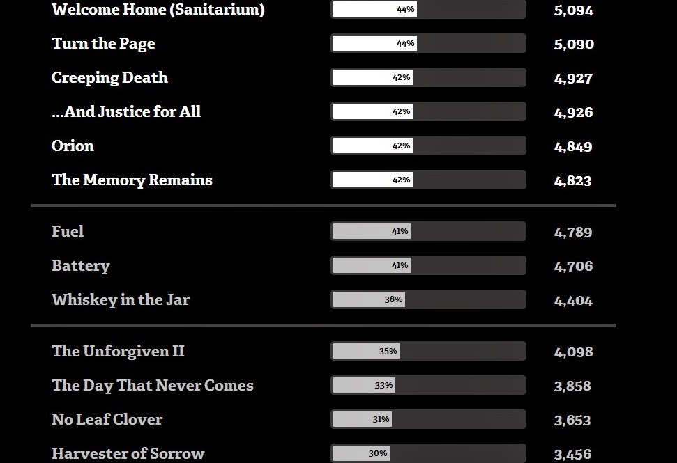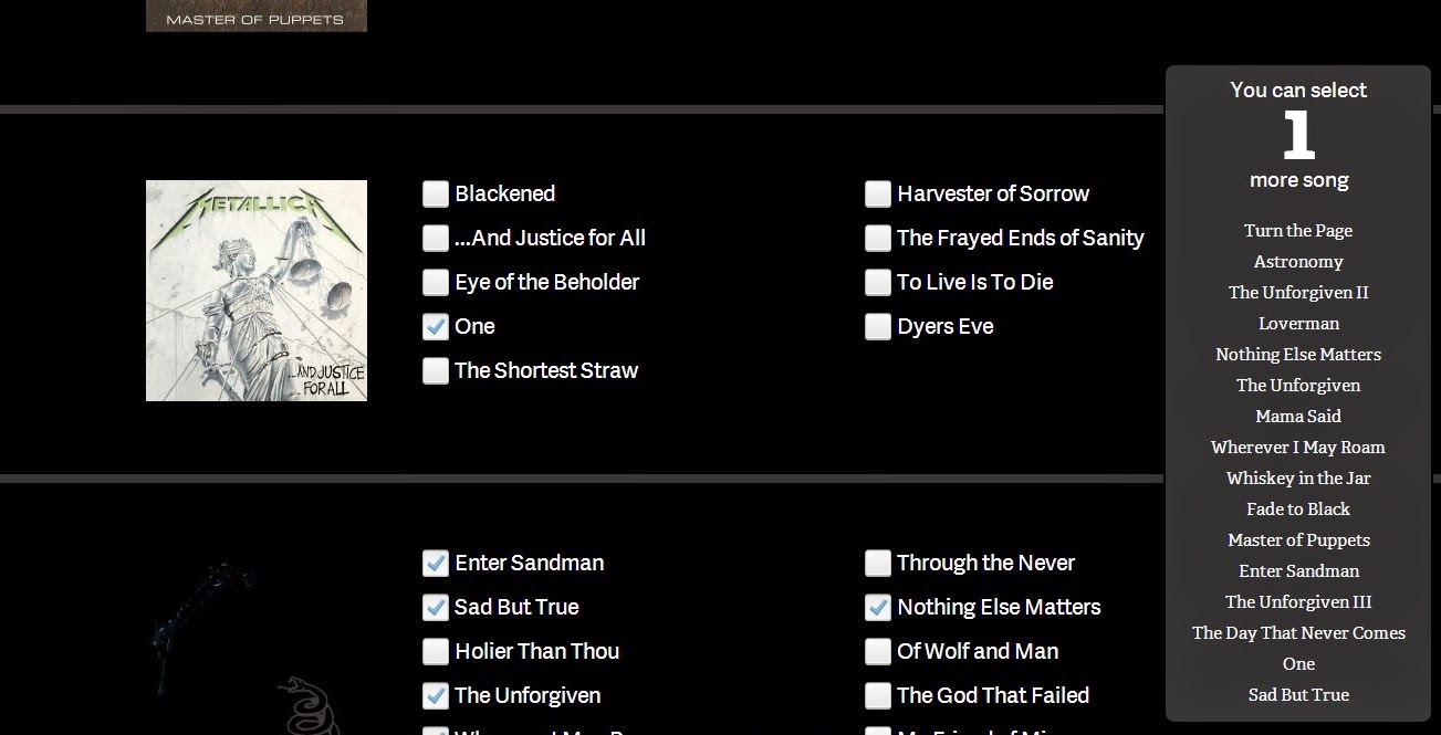 Hemen albüm albüm ayrılmış Metallica şarkılarından seçmeye başlıyorsunuz.