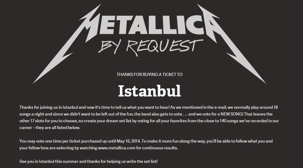 Konserde çalacağı şarkıların kararını seyircilere bırakan Metallica turnesi Metallica By Request için şarkı seçiminde son gün bugün. Biz de eski metalcilerden Zekeriyya’nın yanında aldık soluğu. Aslında kendisi şarkı seçimlerini çok önceleri yapmıştı ama bu yazı için bu süreci son güne bıraktı. Her ne kadar bize, mendille şarkı isteme klişesini hatırlatsa da ilginç bir uygulama olduğu için inceledik.